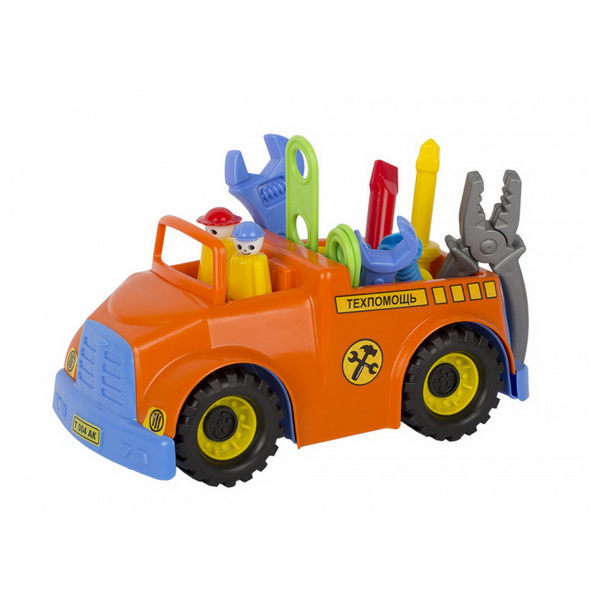 Игрушка Автомобиль "Техпомощь" состоит из 19 предметов: машинка, 2 фигурки, плоскогубцы, отвертка 2шт., ключ 2шт., пластина 3шт., болт 4шт., гайка 4шт. Разноцветные детали можно использовать для знакомства ребёнка с цветом. Играя с этой игрушкой, ребёнок тренирует мелкую моторику, учится обращаться с инструментами и развивает воображение.