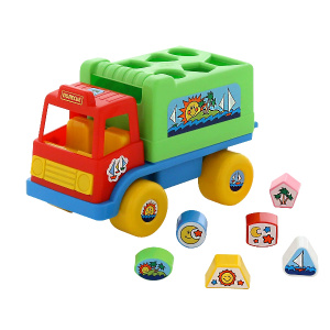 В крыше кузова имеются шесть отверстий разных геометрических форм. К игрушке прилагается набор из шести разноцветных деталей, основания которых также разных геометрических форм. Малышу предстоит подобрать подходящие детали и протолкнуть их в соответствующие отверстия. Таким образом, цветной «груз» окажется в кузове.