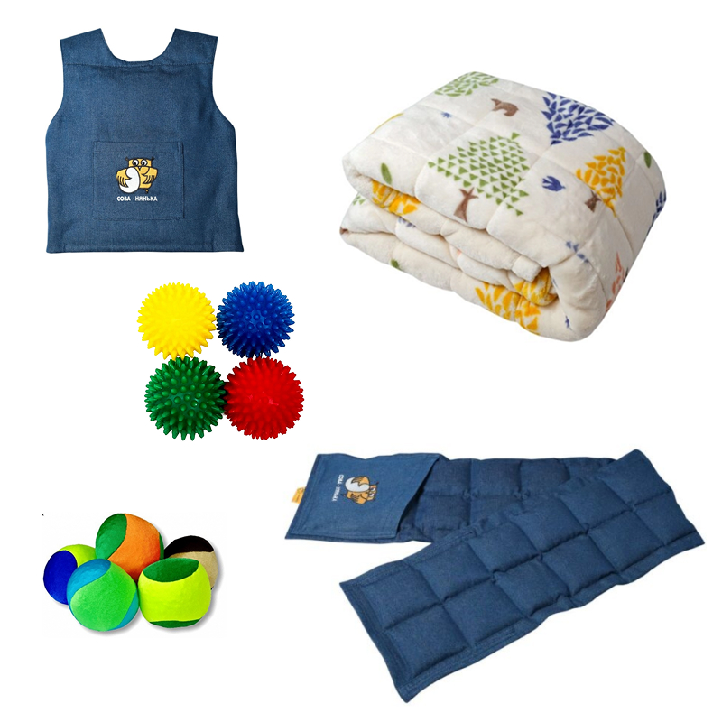 Комплект готов к реабилитационным занятиям с детьми, имеющими ОВЗ. Рекомендуется при расстройствах аутического спектра. Утяжелённые аксессуары (шарф, жилет, плед) наполнены полимерными гранулами, давление которых успокаивает психику. Предметы задействуются во время учебы и отдыха, упражнений на развитие моторных функций, внимания, памяти, чувства баланса.