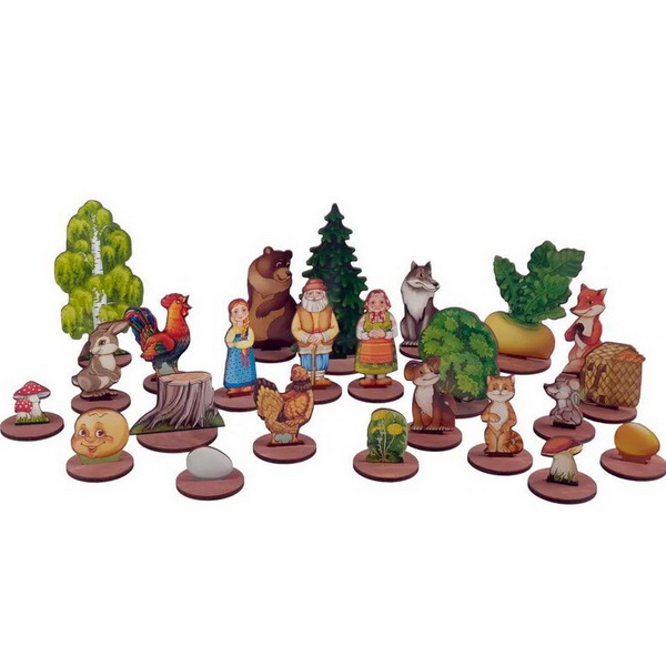Состав набора включает: Береза - 1 шт., Ель - 1 шт., Куст - 1 шт., Одуванчик - 1 шт.,, Репка - 1 шт., Яйцо белое - 1 шт., Яйцо золотое - 1шт., Колобок - 1 шт., Пенек - 1 шт., Гриб боровик - 1 шт., Гриб мухомор - 1 шт., Медведь - 1 шт., Волк - 1 шт., Лиса - 1 шт., Заяц - 1 шт., Мышь - 1 шт., Собака - 1 шт., Кошка- 1 шт., Петух - 1 шт., Курица - 1 шт., Дед - 1 шт. Бабка - 1 шт., Внучка - 1 шт., Туесок - 1 шт.