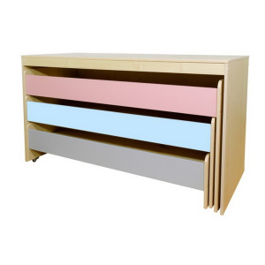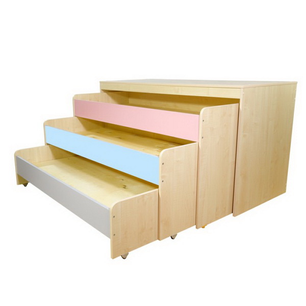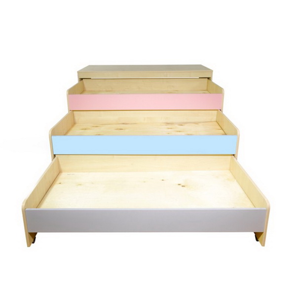 Многоярусная кровать станет незаменимым предметом спальной зоны в детском саду. Благодаря выкатной конструкции значительно экономится пространство помещения. Кровать изготавливается из ЛДСП, ложе из фанеры. Все края ЛДСП покрыты противоударной кромкой ПВХ, в комплект входит тумба.