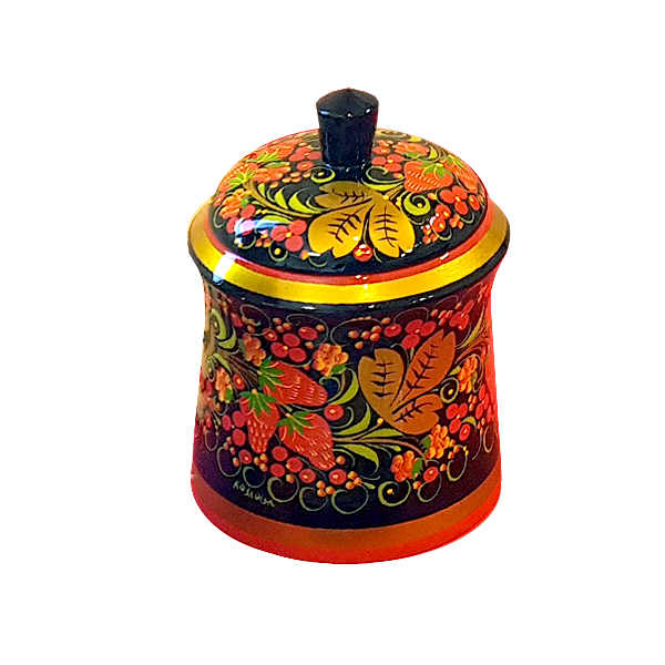 - Поставок с крышкой. Деревянный поставок высотой 15 см и диаметром 11 см украшен хохломской росписью с золотыми листьями и красными ягодами на черном фоне.