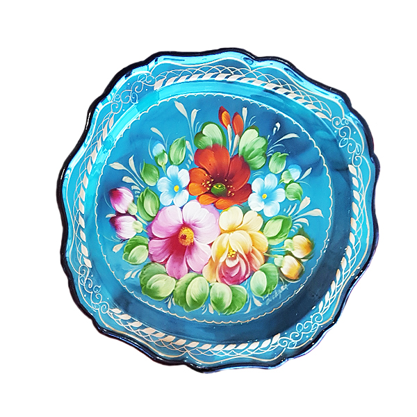 - Жостовский поднос. Металлический поднос 21х18 см имеет овальную форму и фигурный край. Цветочный орнамент на нем выполнен на бирюзовом фоне.