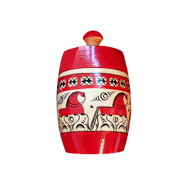 - Бочонок с мезенской росписью. Нарядный деревянный бочонок высотой 14 см украшен традиционными для мезенской росписи мотивами: лаконичными образами лошадок, птиц, геометрическими узорами в красном и черном цветах. Бочонок покрыт прозрачным лаком.
