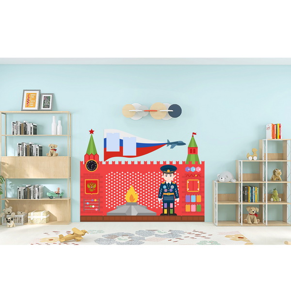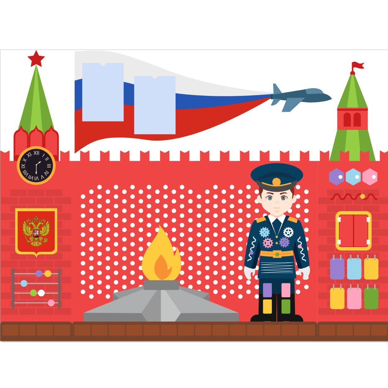 Панель выполнена из перфорированного стенда имитирующим Красную площадь - сердце Москвы! В панели присутствуют развивающие элементы на зданиях имитируемого Кремля. Бизиборд в виде Защитника Родины имеет вращающиеся элементы, бегунки и шестеренки.