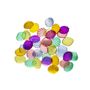 2 размера ракушек (5,4 см и 4 см), в 6-ти цветах, 6 различных тактильных поверхностей.