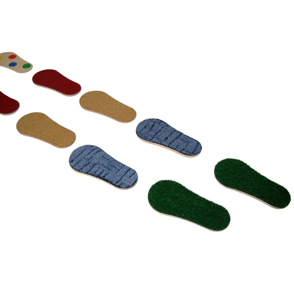 Набор состоит из 6 пар стоп, с различными текстурами на поверхности, используемых для хождения, а также для ощупывания руками.