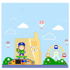 - площадку для занятием скейтбордингом, на которой размещены шестерёнки, счётная спица с шарами, игра на соответствие и модуль «Погремушка» с бисером;