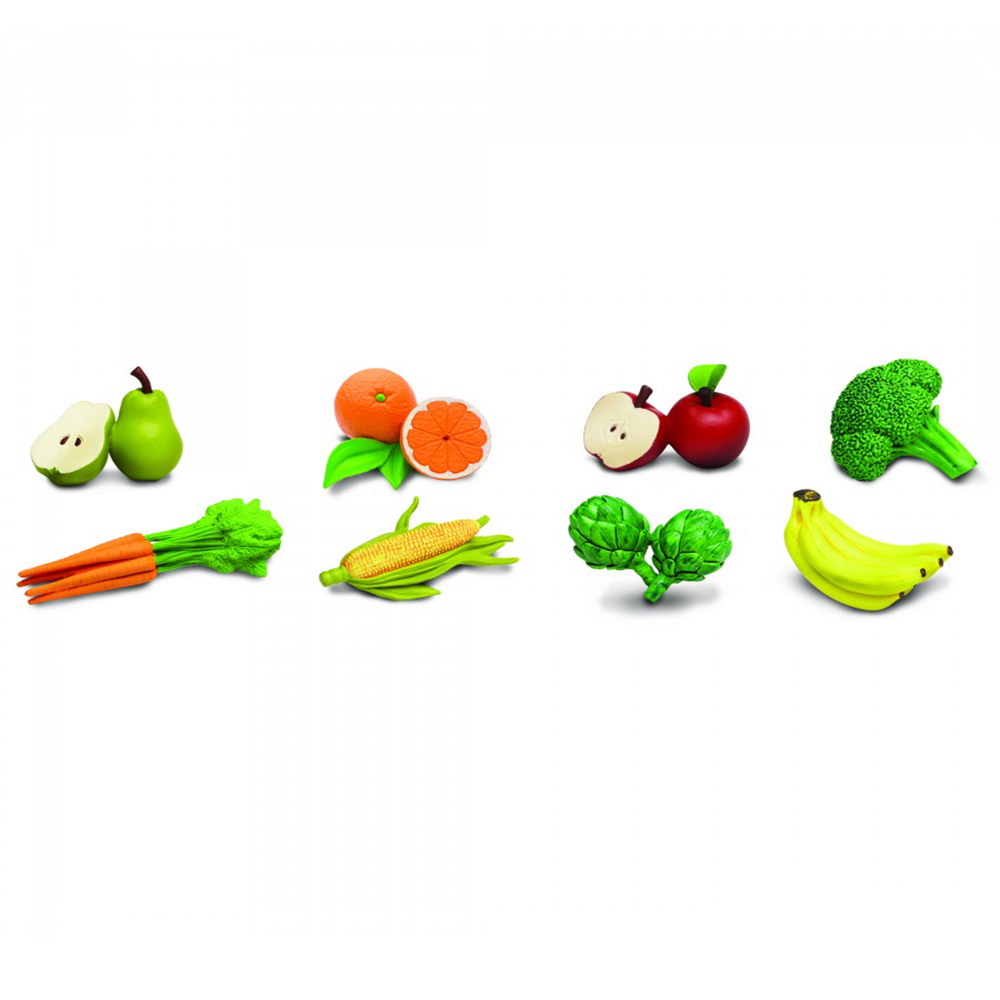 Набор из 8 фигурок овощей и фруктов: груши, апельсины, яблоки, артишоки, морковь и бананы, а также брокколи и кукуруза.