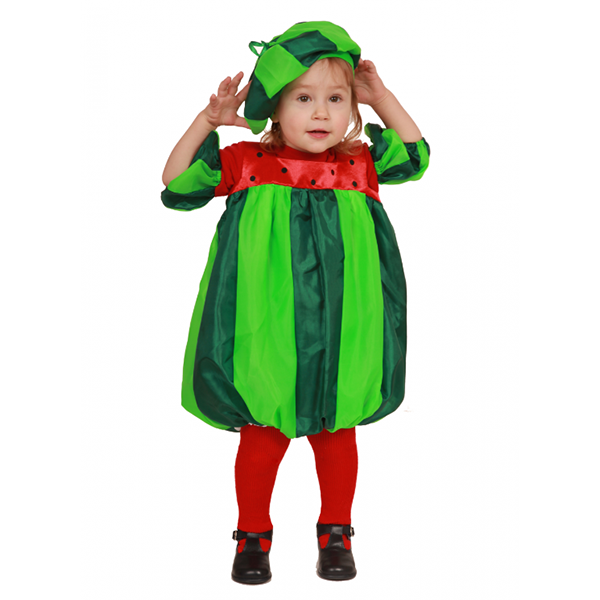 Карнавальный костюм Арбузик предназначен для праздников в детском саду, костюмированных Дней рождения, новогодних огоньков и прочих мероприятий. В этом необычном маскарадном костюме Ваш ребенок будет самым оригинальным и ярким героем на любом празднике. Комплектность: сарафанчик, шапочка, рукава.